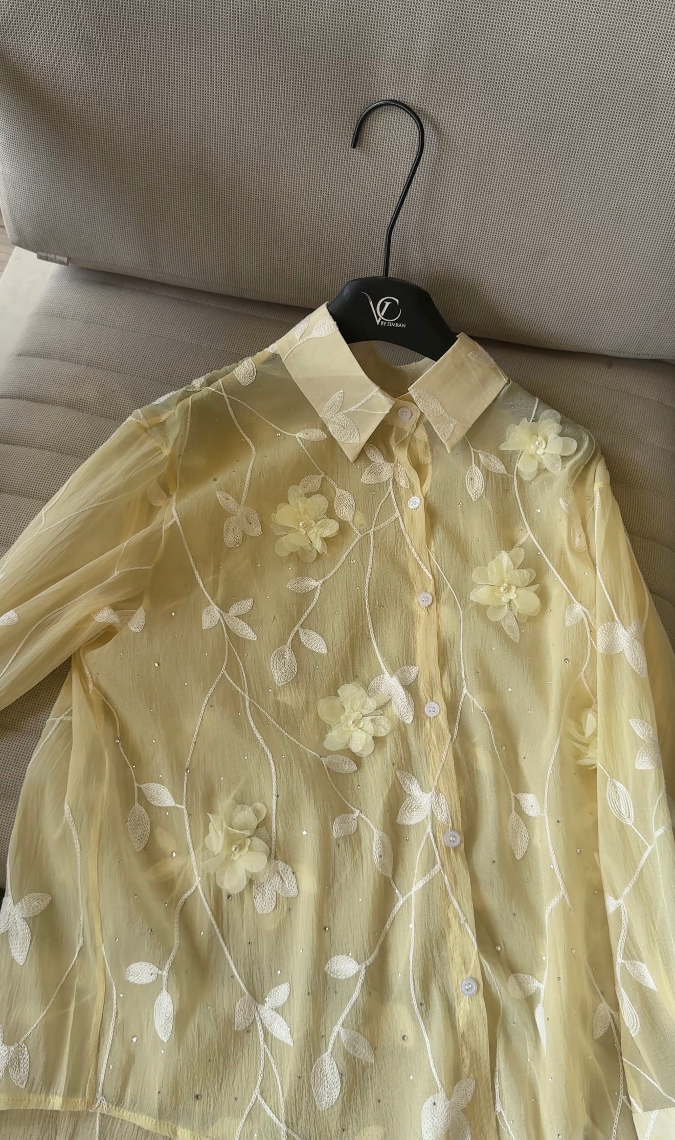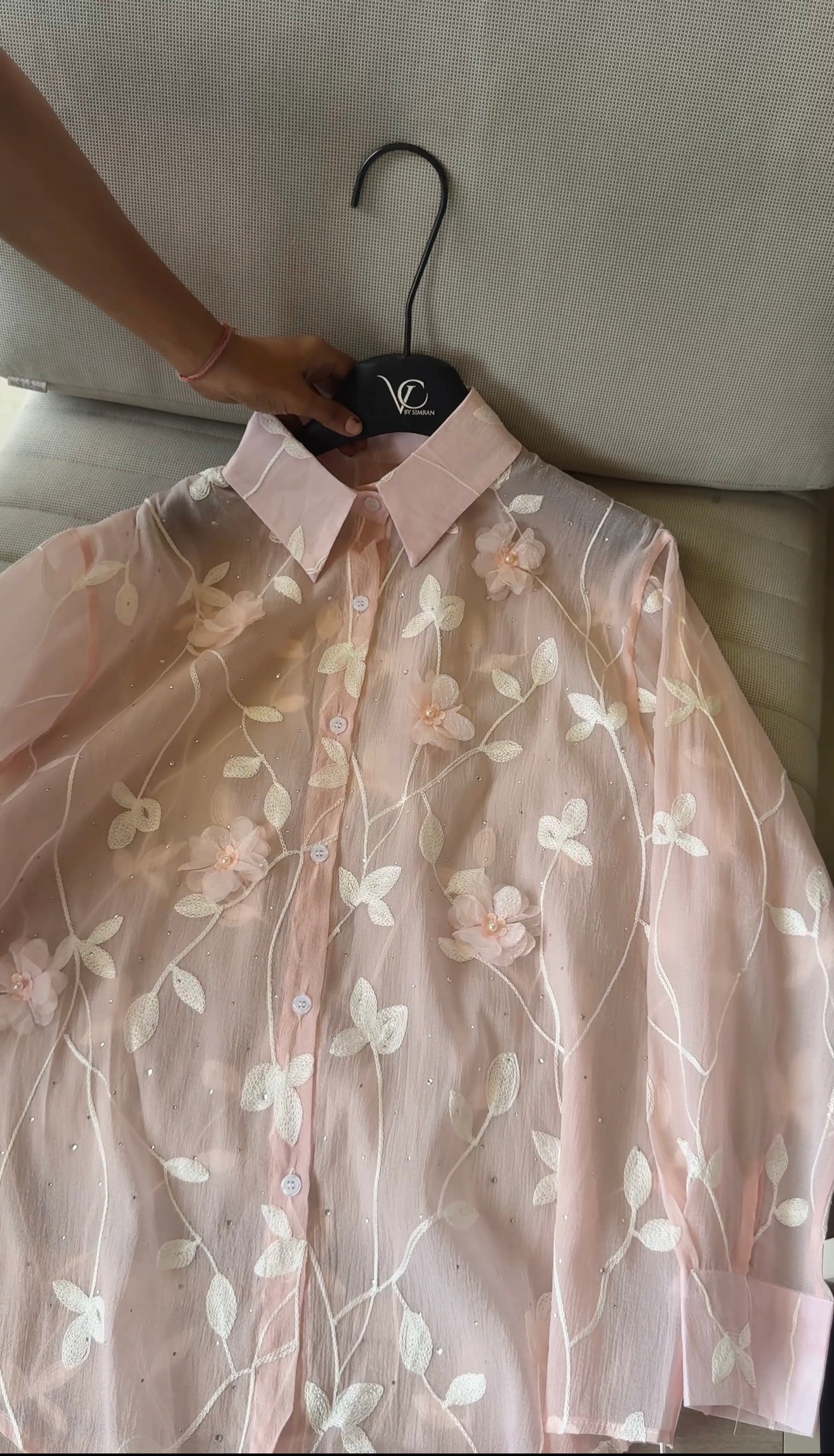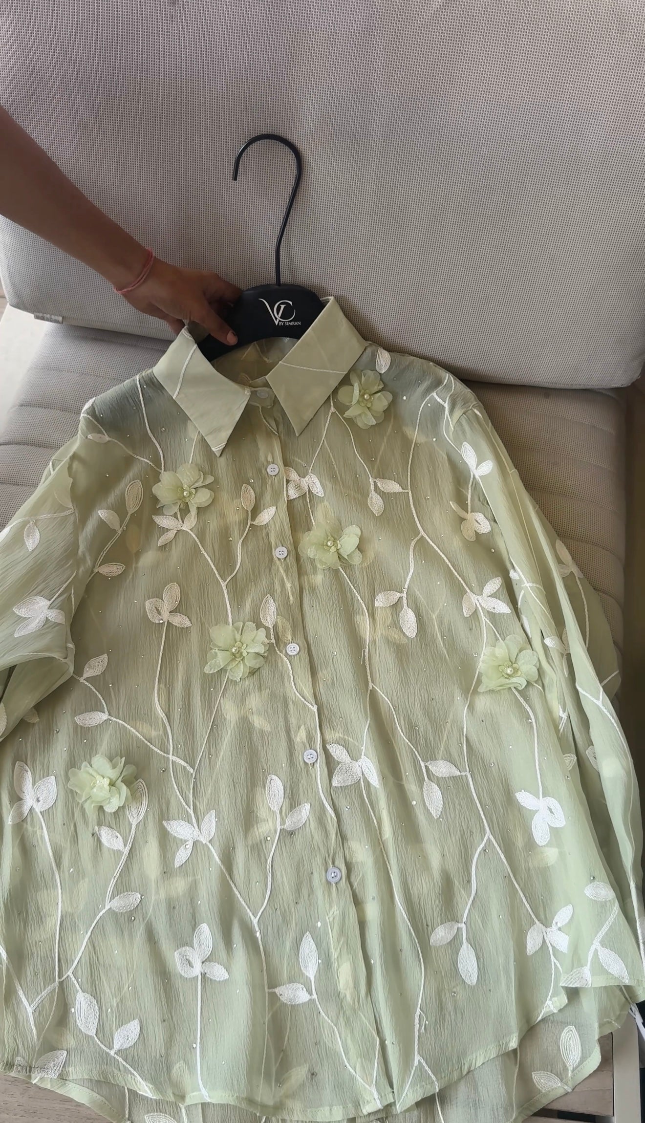 This pastel green sheer blouse, adorned with 3D floral appliqués and embroidered vines, is perfect for a breezy, graceful look.