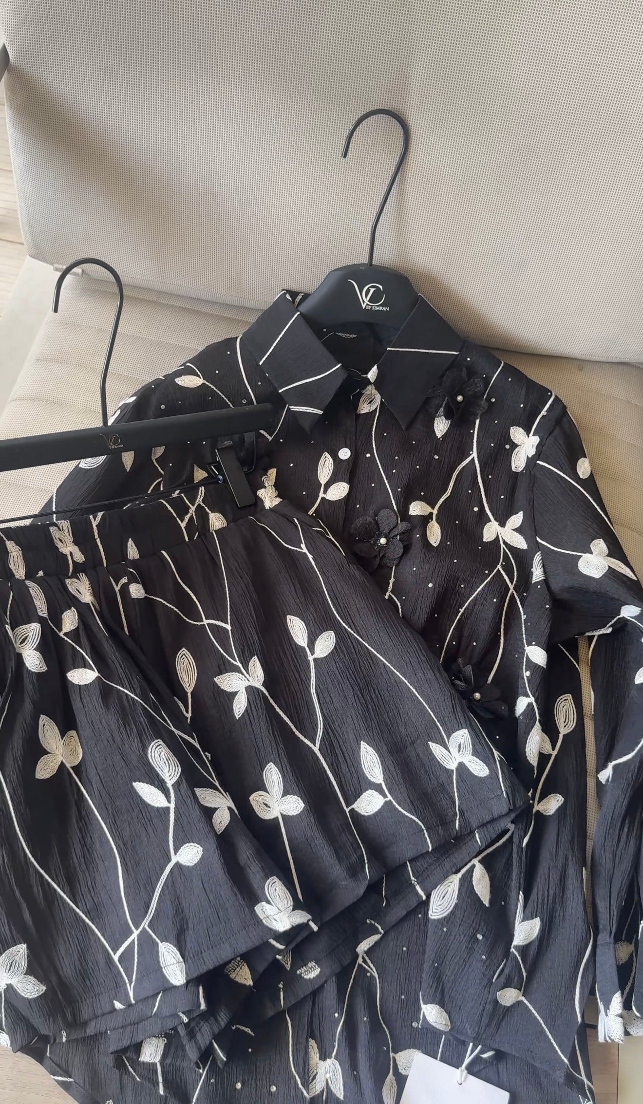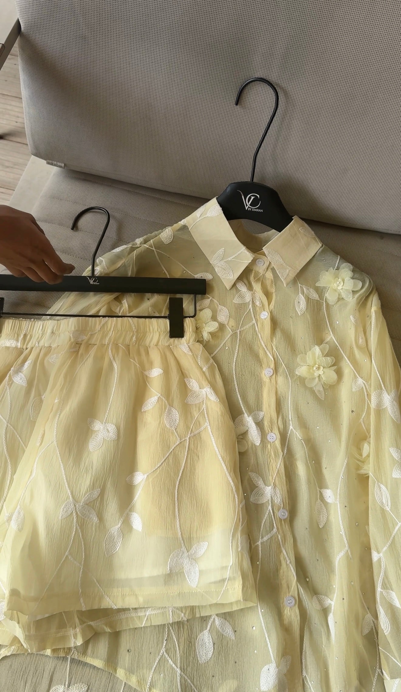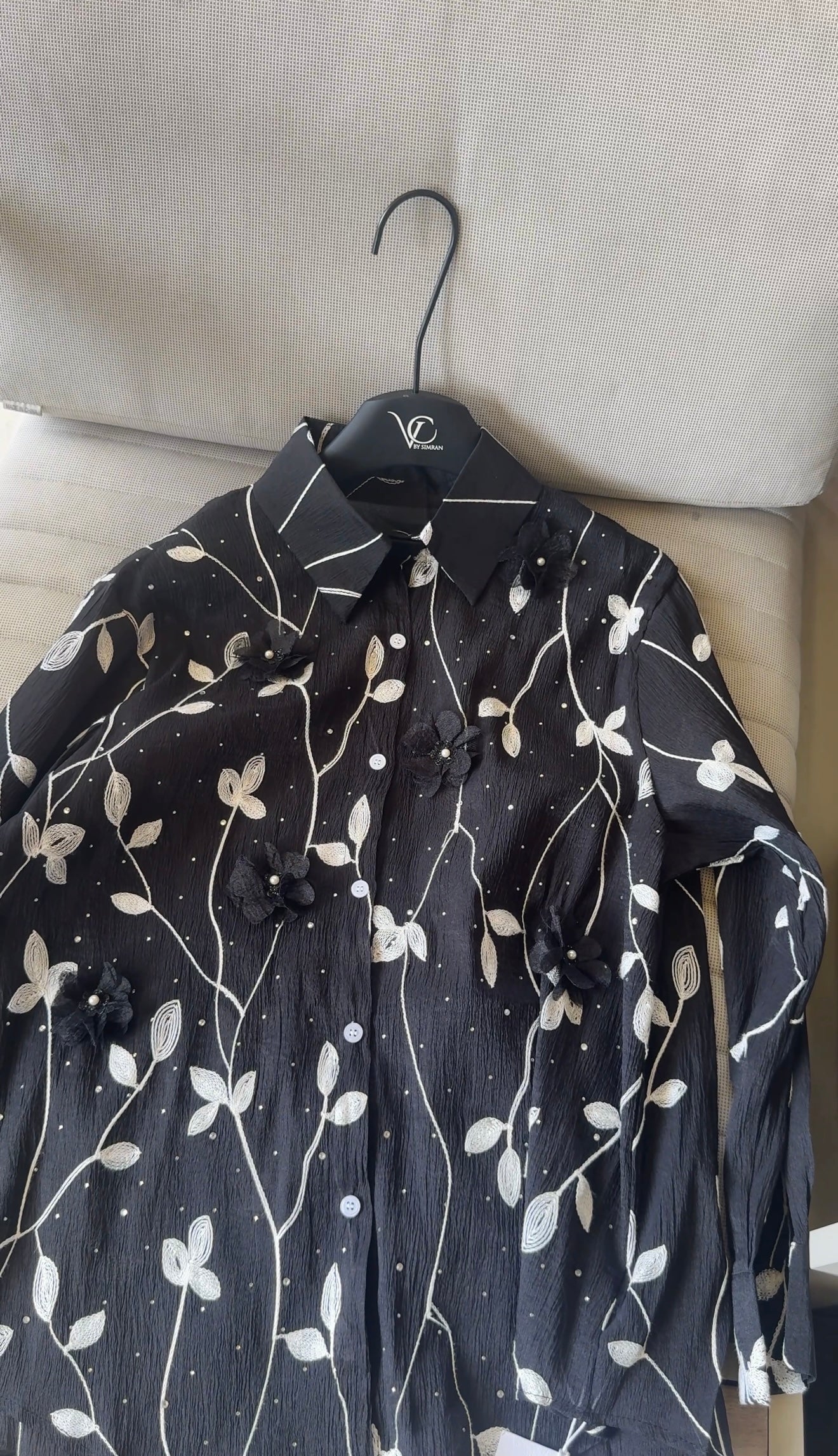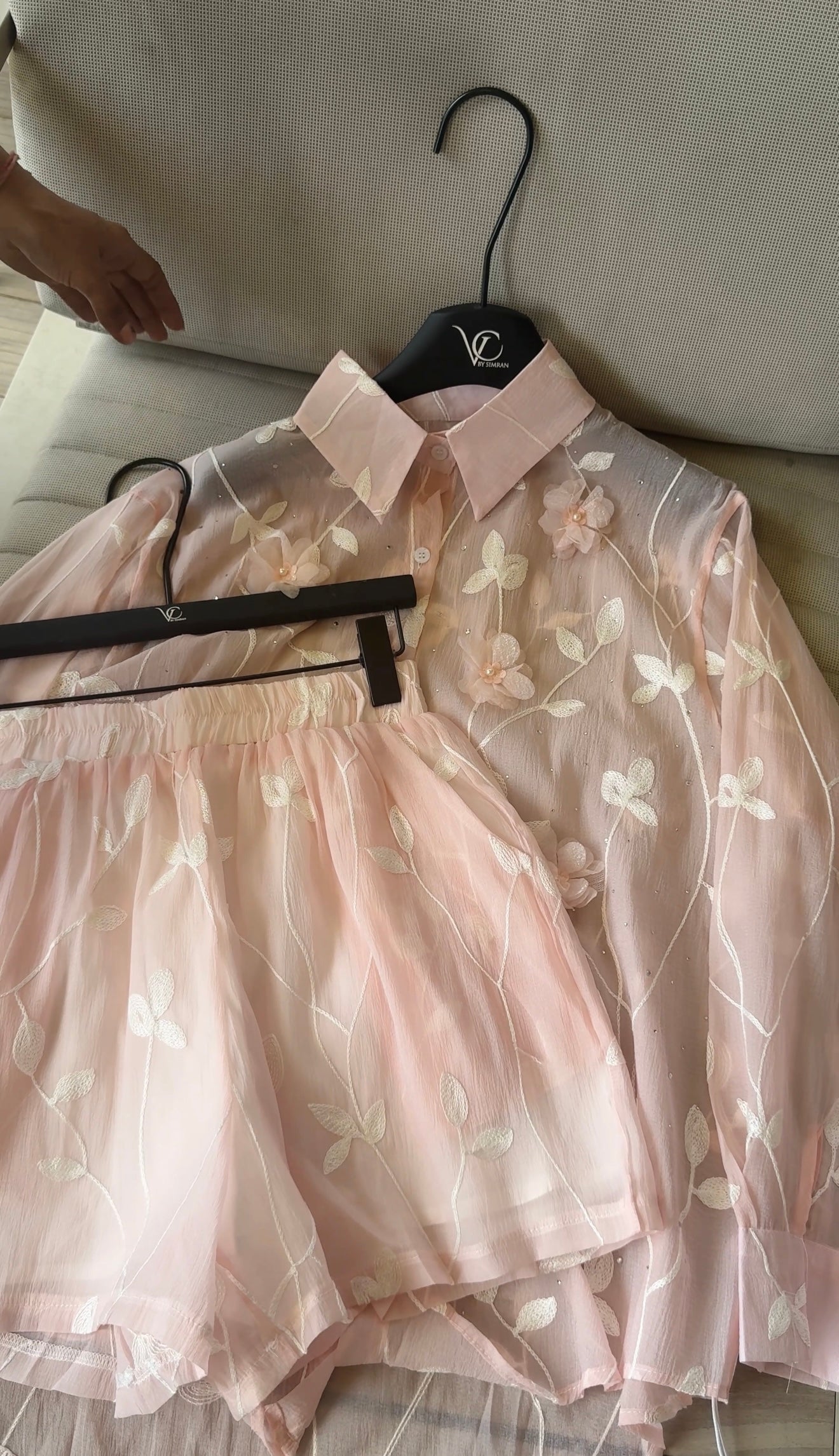 This pastel green sheer blouse, adorned with 3D floral appliqués and embroidered vines, is perfect for a breezy, graceful look.