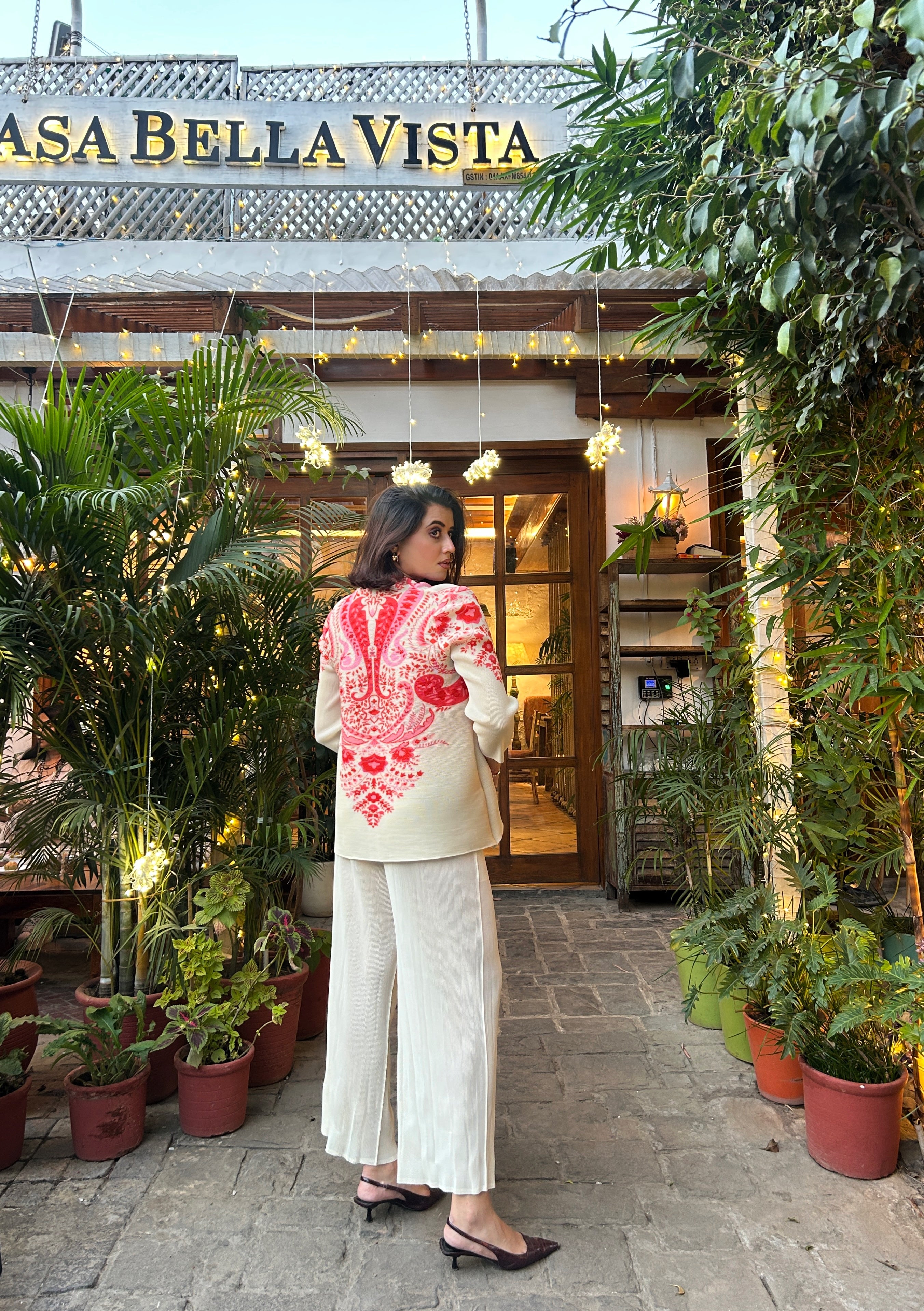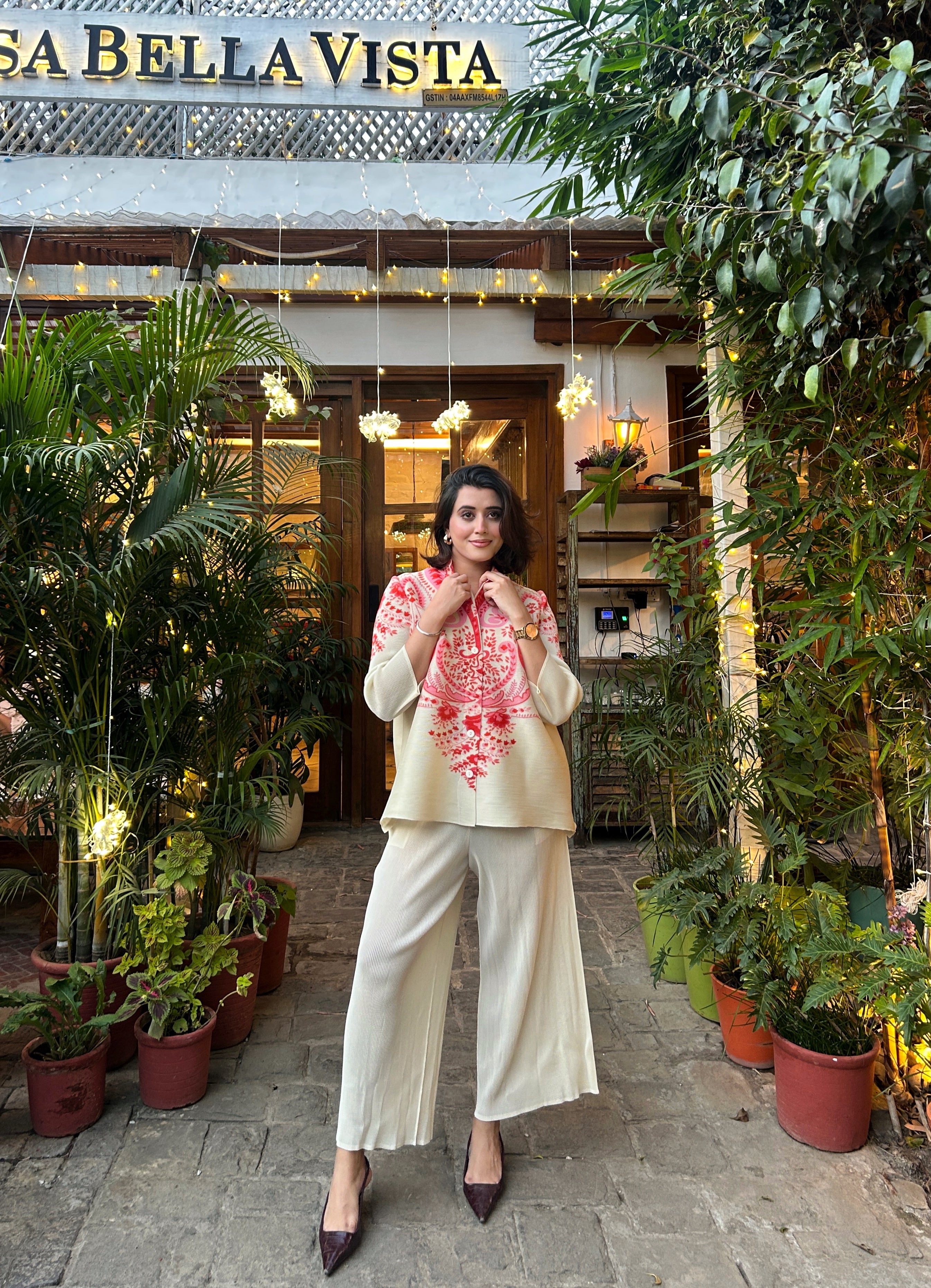 A chic, semi-casual outfit featuring a cream long-sleeved kurta with striking pink and red floral embroidery on the front, paired with cream wide-leg pleated trousers. The kurta has a straight hem and a relaxed fit, offering a contemporary yet traditional appeal. The look is completed with pointed-toe heels in a deep maroon shade, perfect for brunches, casual gatherings, or festive outings.