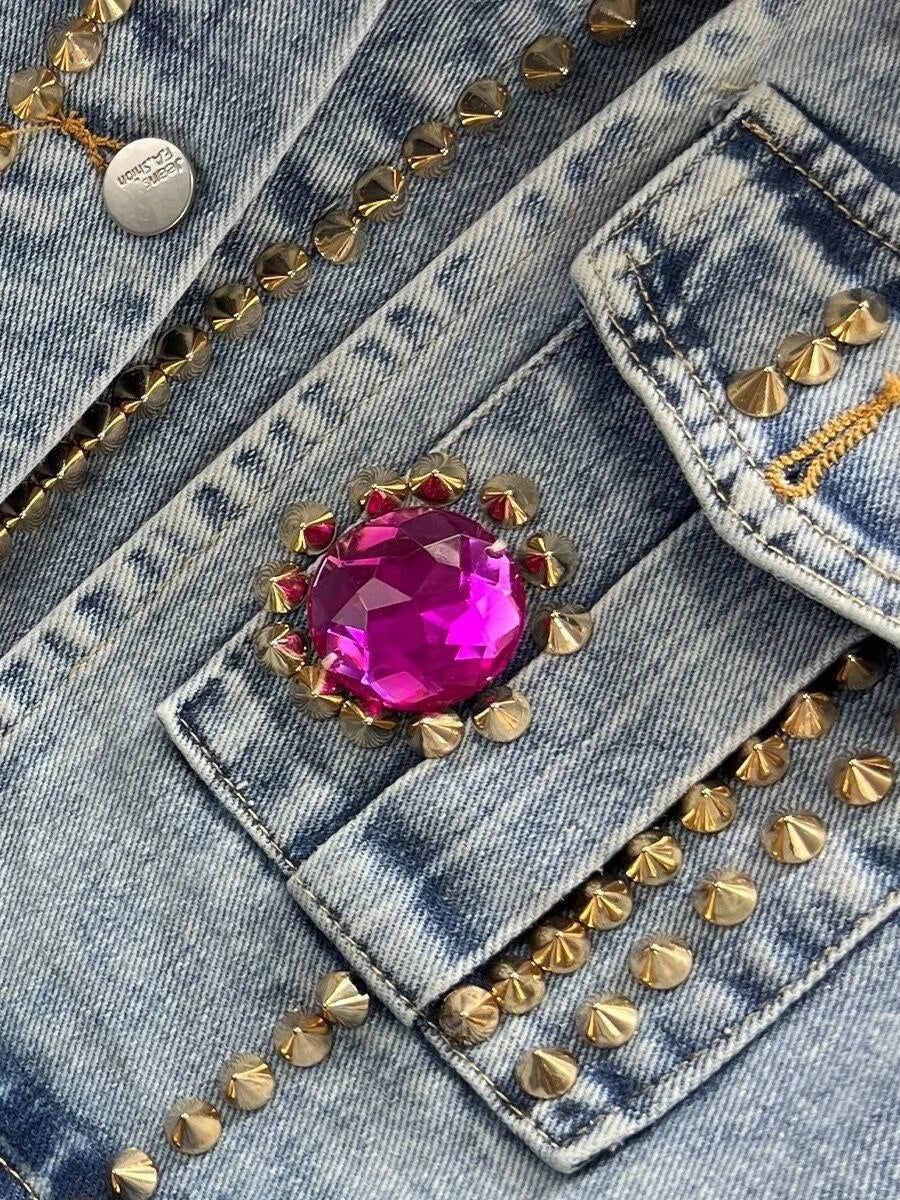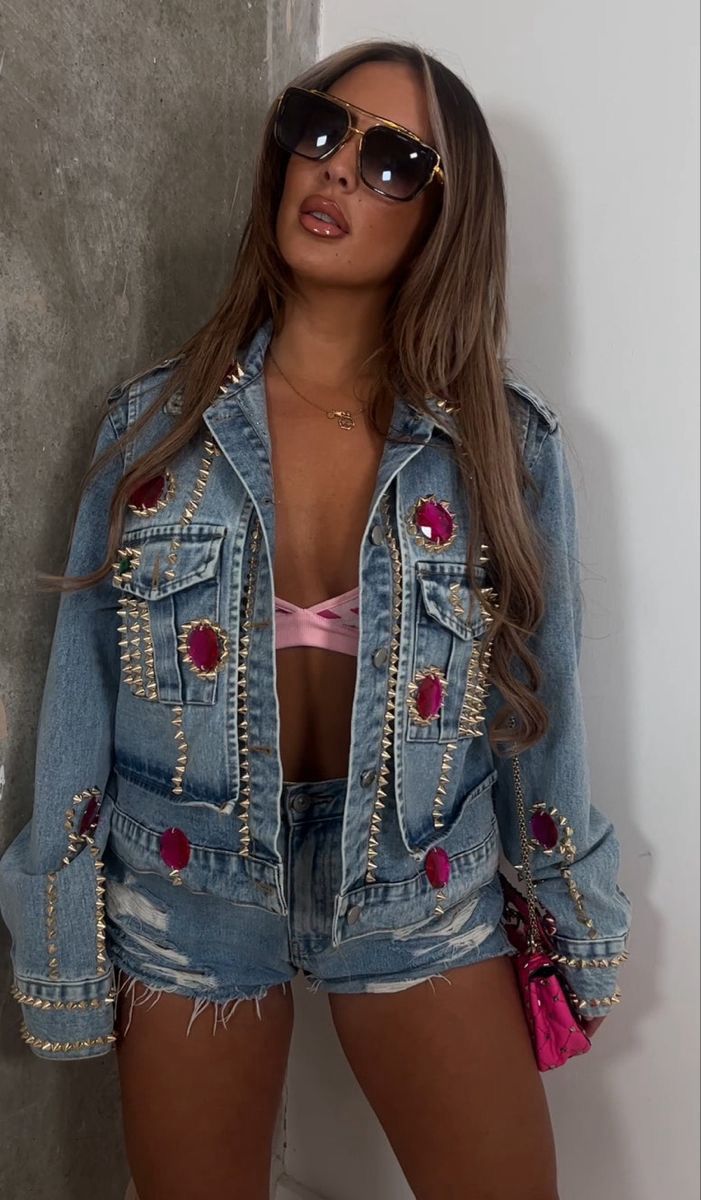 Turn heads in our Denim Diva Luxe Jacket, a statement piece that redefines glam street style. Crafted from soft, washed denim, this cropped jacket is adorned with bold fuchsia crystals, emerald accents, and gold stud detailing that adds a daring touch of luxury. Perfect for fashion-forward souls who love a mix of edge and elegance — wear it over a sleek dress or casual co-ords to instantly elevate your look.