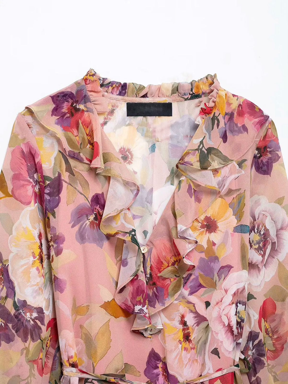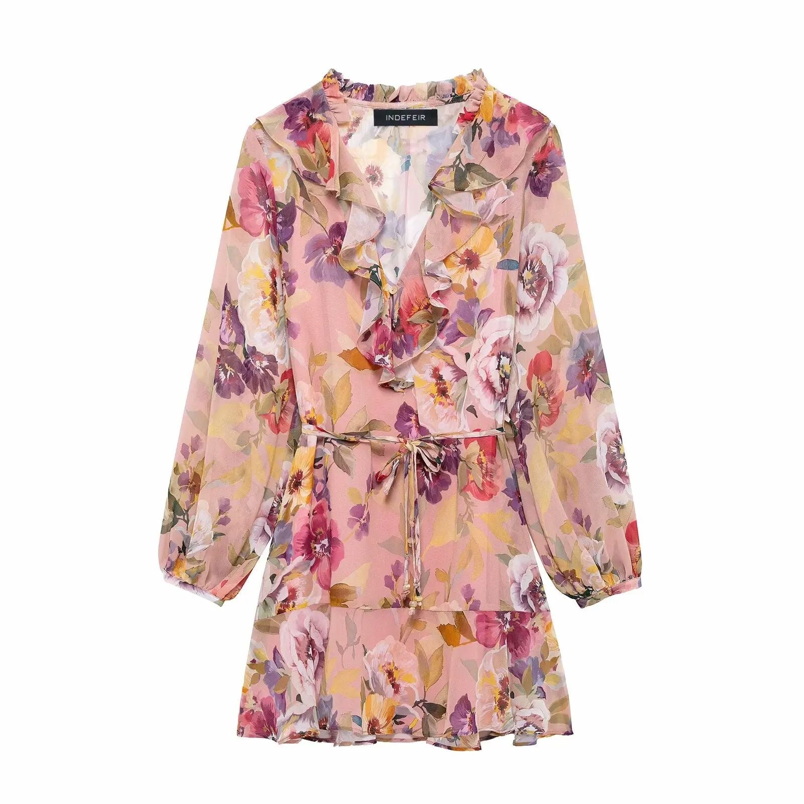 Romantic and effortlessly feminine, this Indefeir mini dress is crafted from lightweight chiffon with an all-over floral print in soft blush, lilac, and warm sunset tones. It features a delicate ruffled neckline that cascades into a flattering V-front, balanced by long sheer sleeves with gentle volume at the cuffs. A slim self-tie belt cinches the waist for a customizable fit, while the softly flared hem adds graceful movement. Perfect for brunch dates, garden parties, or special daytime occasions, this dress blends elegance with an easy, airy feel.