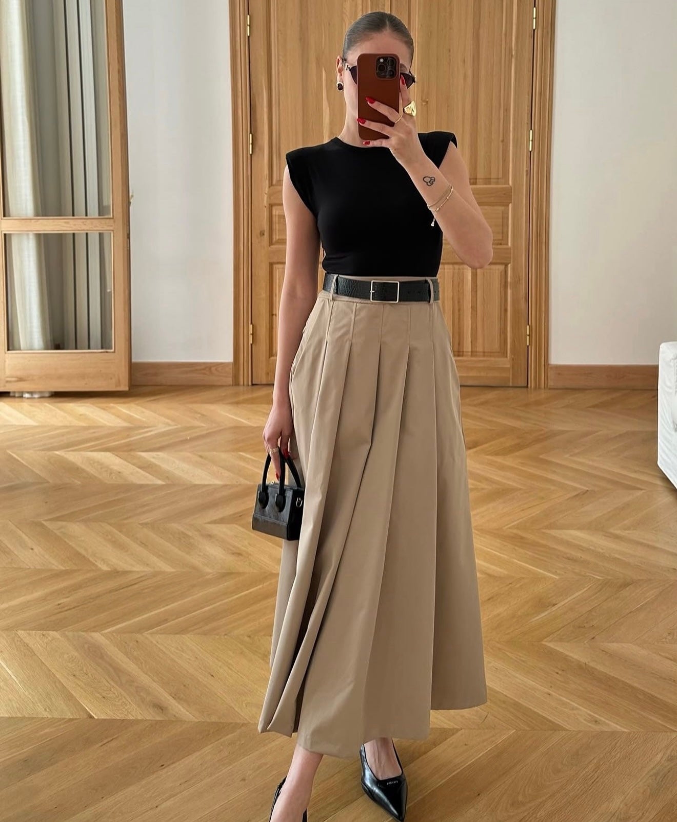 Minimalist yet striking, this sleeveless black-and-beige maxi dress is the perfect balance of modern elegance and timeless style. The fitted black bodice accentuates the waist, while the high-rise pleated beige skirt flows gracefully to ankle length, creating a flattering silhouette. Finished with a belted detail for definition, this dress is ideal for work meetings, formal gatherings, or chic evening outings.
