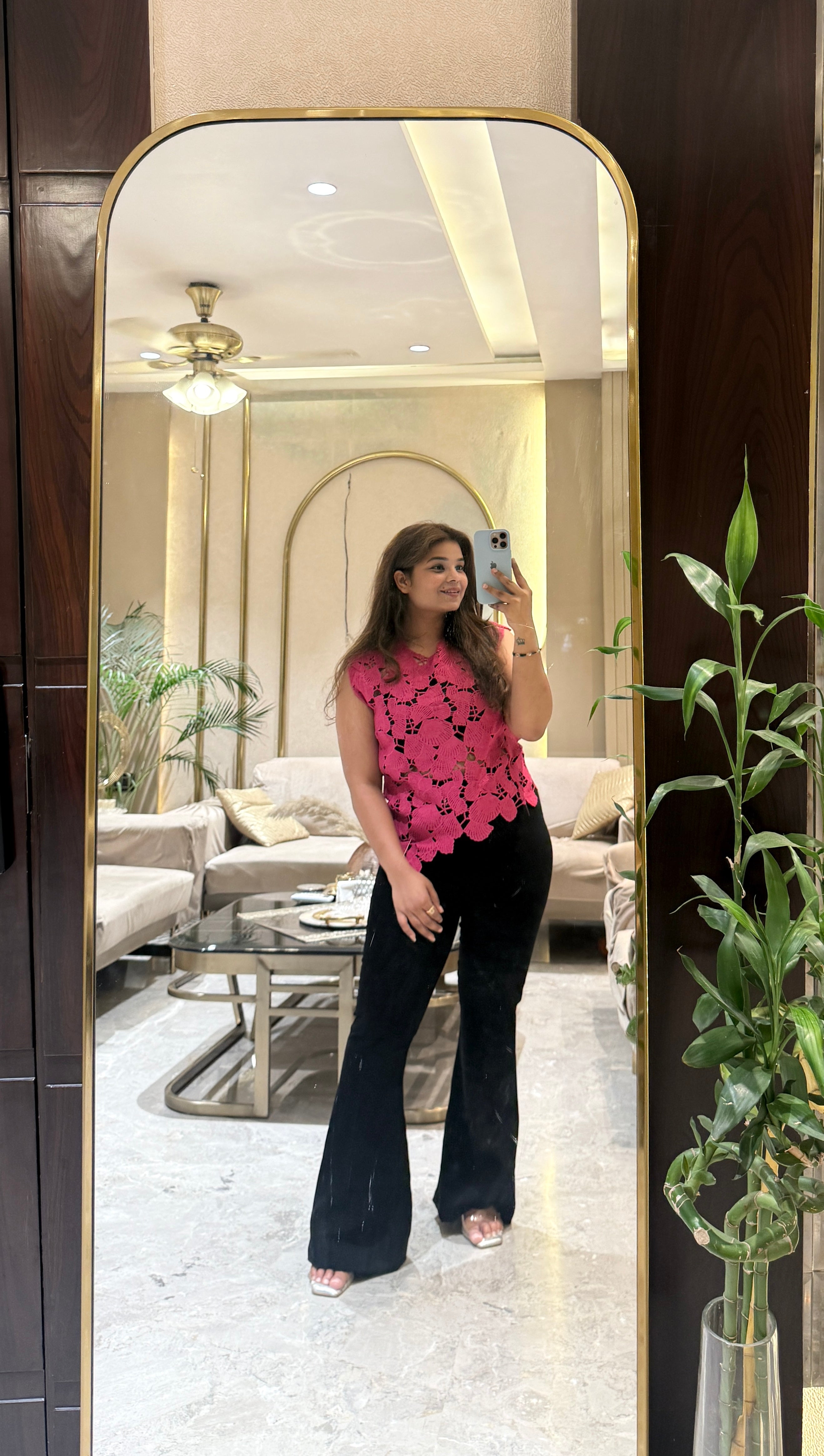Make a bold statement with this hot pink crochet floral top, designed for fashion lovers who embrace vibrant elegance. Featuring oversized floral motifs and an airy openwork design, this sleeveless piece is perfect for layering over a black or nude camisole. The asymmetric hemline and relaxed fit add a stylish edge, making it ideal for brunch dates, vacations, or evening outings. Pair it with black trousers, jeans, or skirts for a stunning contrast look.