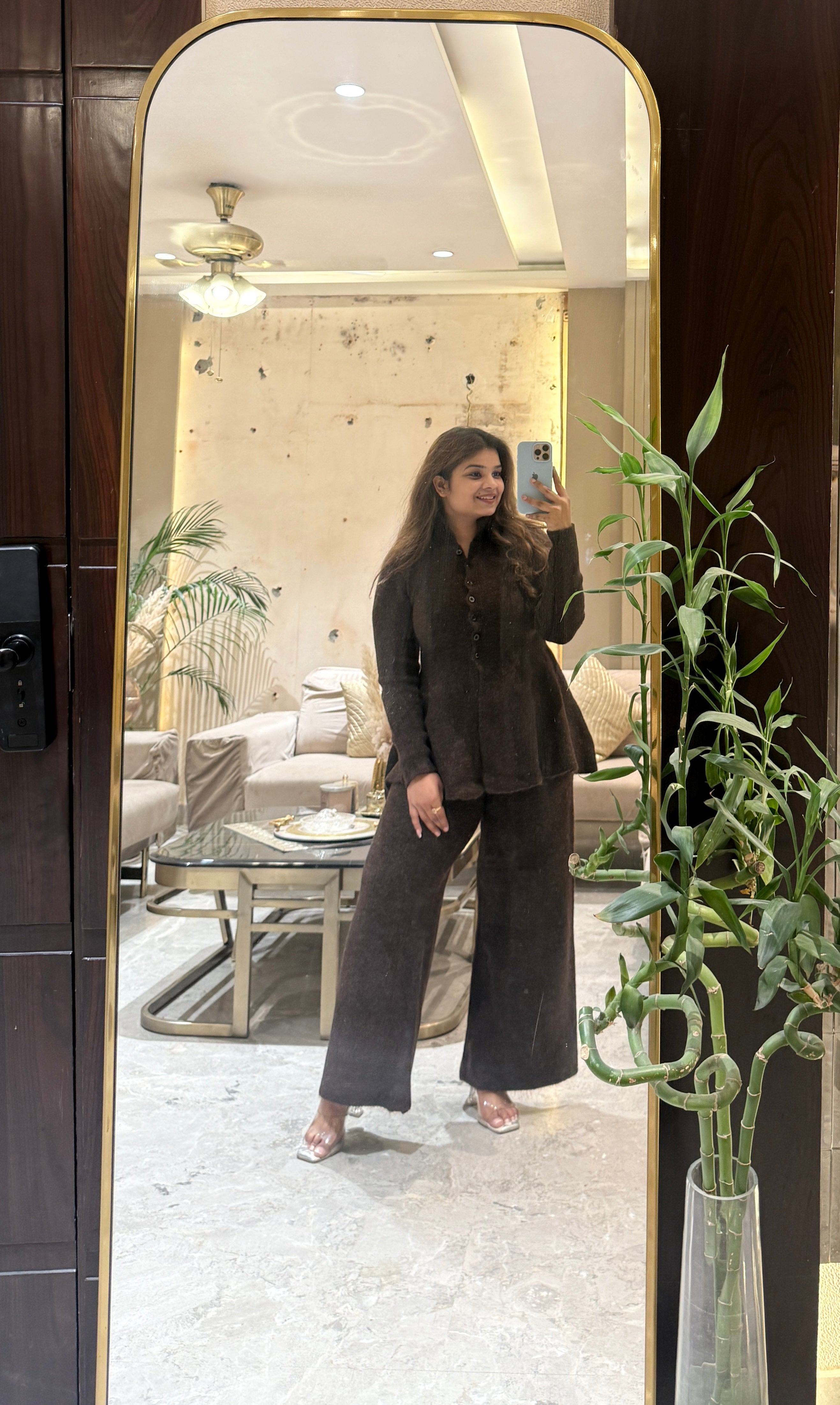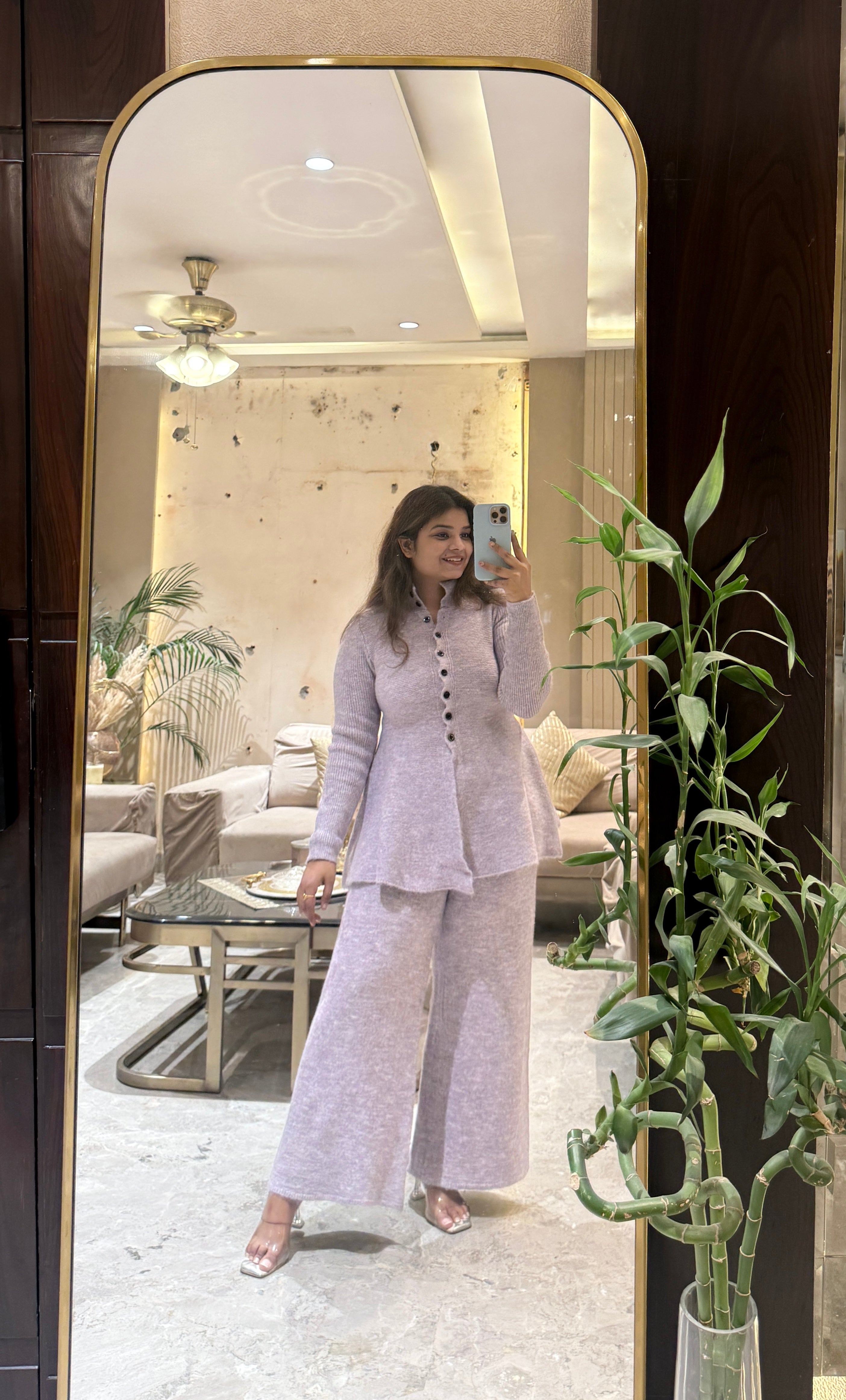 A cozy yet chic two-piece set crafted from a soft, textured knit fabric. The top features a front button-down design with a slight peplum flare, long sleeves, and a relaxed fit for effortless style. The matching wide-leg pants offer comfort and ease of movement, making this set perfect for lounging, travel, or casual outings.