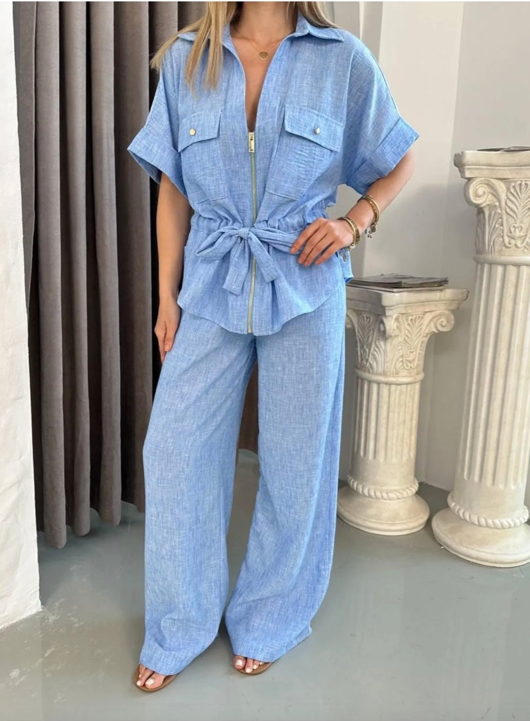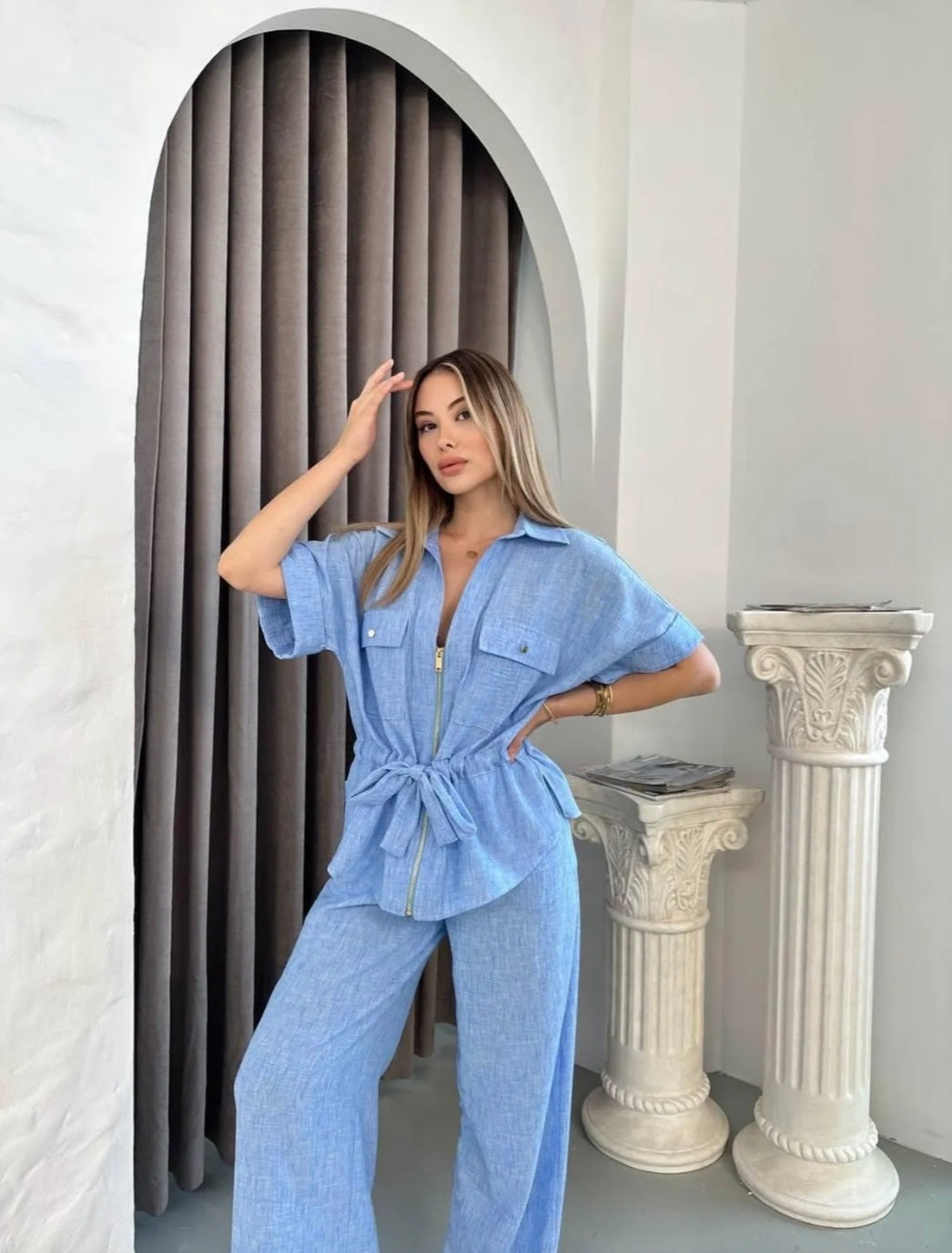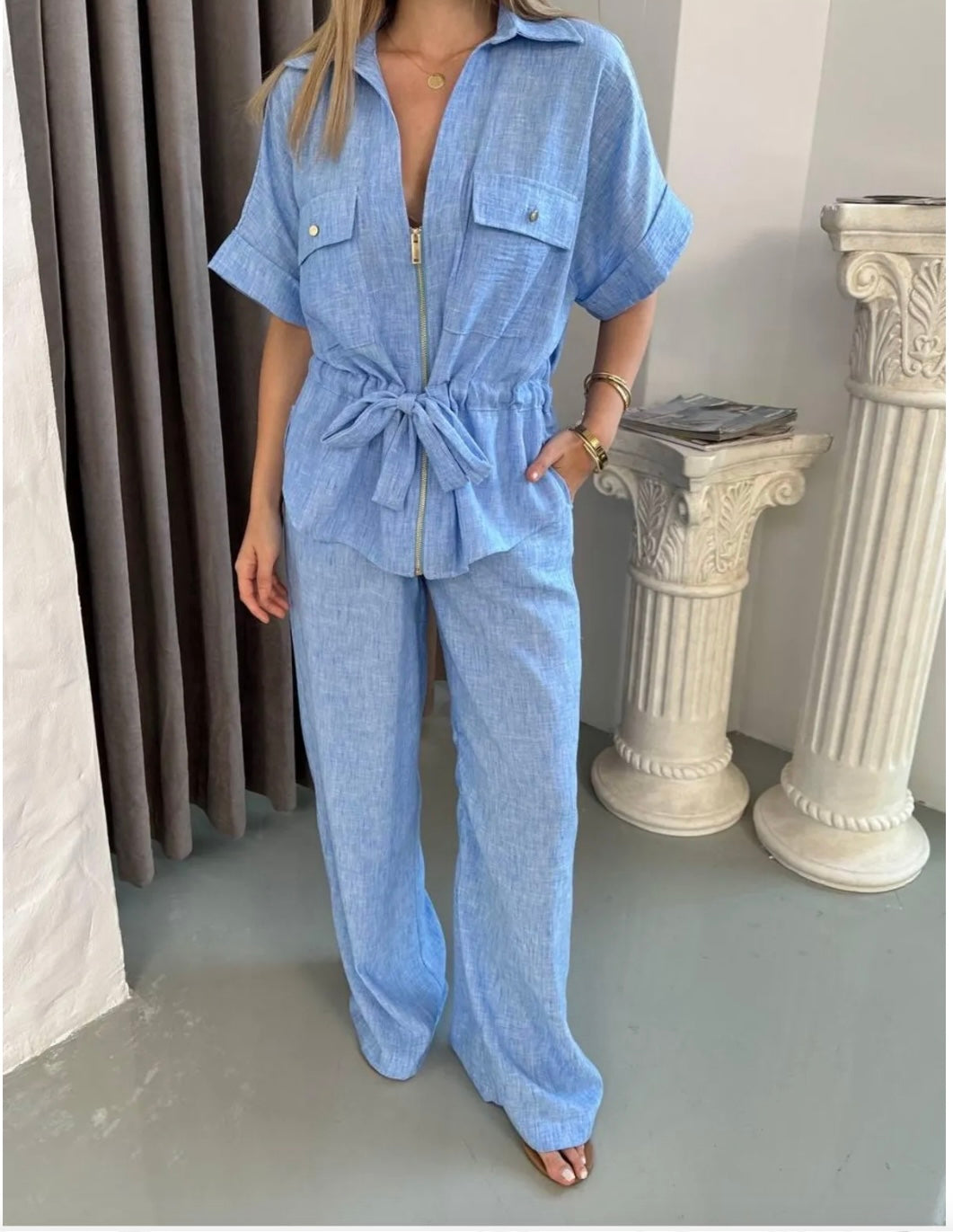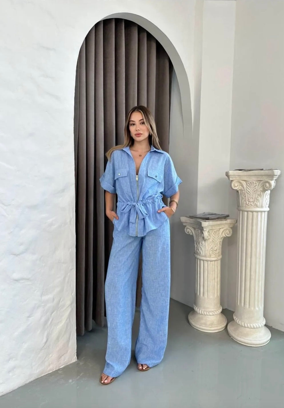 Effortlessly chic and comfortable, this light blue linen-blend co-ord set features a short-sleeve button-down top with a stylish front zipper and tie-waist belt, paired with wide-leg high-waisted pants. The relaxed fit and breathable fabric make it perfect for warm days, while the classic shirt collar and flap pockets add a polished touch. Dress it up with heels or keep it casual with sandals for an elevated everyday look.
